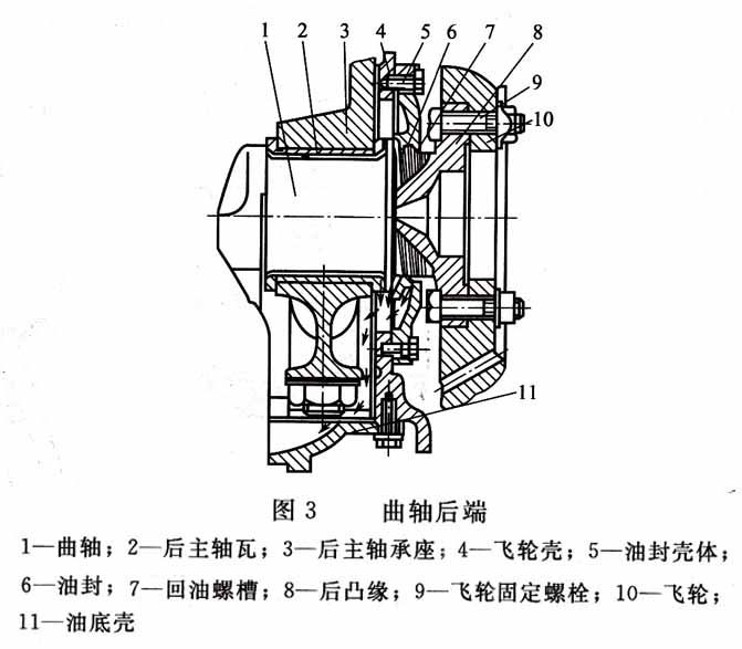 5、如圖3所示,一般曲軸的后端設有油封、回油螺槽、后凸緣等結構。曲軸后端的尾部伸出機體外,以便將柴油機的功率輸送給配套機具的傳動裝置。后端多裝有飛輪,通過花鍵或凸緣與其相配,然后用螺栓固緊。由于飛輪尺寸大而重,因此對螺栓的緊固有一定的要求。