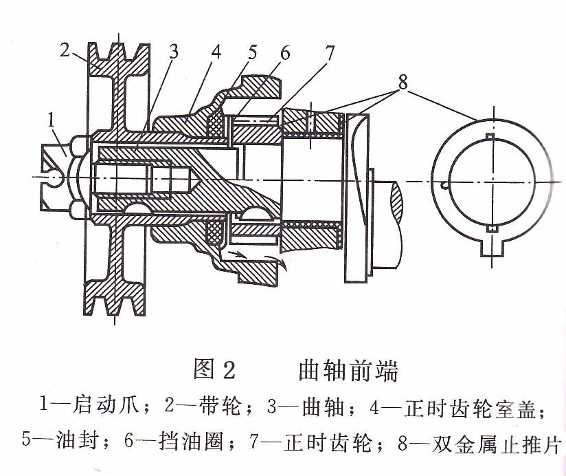 曲軸的制成有臺肩的圓柱形,圖2所示,其上分別裝有正時齒輪、擋油圈、油封、帶輪和止推片等零件。有些中小功率柴油機曲軸前端設有啟動爪,另有一些高速柴油機的曲軸前端設有動力輸出裝置。