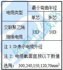 (2)電纜路徑的上下左右轉(zhuǎn)向部位,均應(yīng)滿足電纜允許彎曲半徑要求。如下表所示。