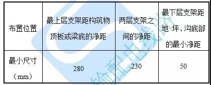 e)水平敷設(shè)時電纜支架的最上層、最下層及兩層之間布置尺寸,應(yīng)不小于下表所列值。