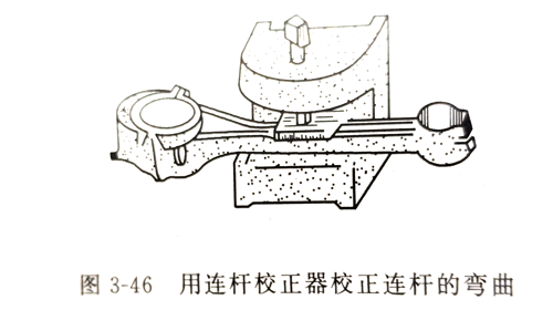 連桿彎曲度的校正,一般是利用連桿校正器上的附屬工具進(jìn)行,如圖3-46所示,根據(jù)連桿彎曲的方向,把校正的專用工具夾在虎鉗上,對(duì)連桿進(jìn)行壓正。注意;要邊壓邊檢查,直至連桿校正為止。