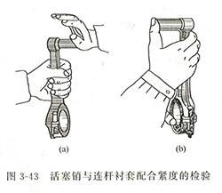 對(duì)柴油發(fā)電機(jī)組的柴油機(jī)而言,一般的檢驗(yàn)方法是:將活塞銷涂以機(jī)油,能用手掌的力量把活塞銷推入連桿襯套,并且沒(méi)有間隙的感覺(jué),則認(rèn)為松緊度為合適【圖3-43(a)】對(duì)汽油機(jī)而言,一般的檢驗(yàn)方法是:將活塞銷涂以機(jī)油,能用大拇指的力量把活塞銷推入連桿襯套,并且沒(méi)有間隙的感覺(jué),則認(rèn)為松緊度為合適【圖3-43(b)】;接觸面積在75%以上,并且接觸點(diǎn)分布均勻,輕重一致,則認(rèn)為接觸面符合要求。