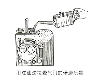 將磨好的氣門裝入座內(nèi),加入少許汽油或柴油,如下圖所示。若5min內(nèi)氣門與座之間沒有滲漏現(xiàn)象,則表示氣門密封良好。