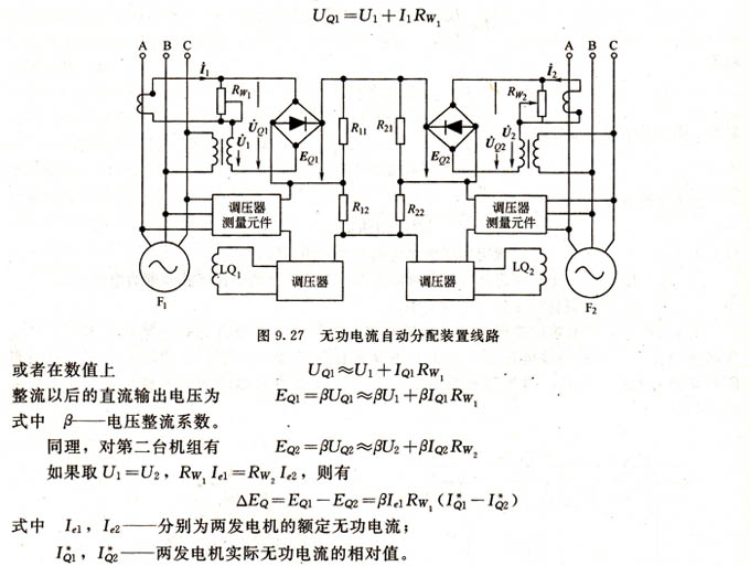 圖9.27中的兩組整流橋輸出分別經(jīng)過(guò)均壓電阻R12和R22并聯(lián)在一起,其等效電路如圖9.28所示。R12和R22上的電壓分別和各發(fā)電機(jī)調(diào)壓器的測(cè)量元件電壓相疊加,當(dāng)兩發(fā)電機(jī)的無(wú)功電流不相等時(shí),例如IQ1>lQ2,則EQ1> EQ2,電阻R12和R22上出現(xiàn)環(huán)流△i,這一環(huán)流在R12上的壓降+△Uε。將提高第一臺(tái)發(fā)電機(jī)的測(cè)量電壓,使調(diào)壓器減小該發(fā)電機(jī)的勵(lì)磁電流,從而減小發(fā)電機(jī)的無(wú)功功率;而環(huán)流在R22上的壓降- AUs。將減小第二臺(tái)發(fā)電機(jī)的測(cè)量電壓,從而增大該發(fā)電機(jī)的勵(lì)磁電流和無(wú)功功率,直到兩臺(tái)發(fā)電機(jī)的無(wú)功電流完全相等,EQ1=EQ2,環(huán)流消失,無(wú)功電流的分配過(guò)程也隨之結(jié)束。在無(wú)功功率達(dá)到均衡分配以后,由于R12和R22上的壓降為零,調(diào)壓器的測(cè)量環(huán)節(jié)即不再受無(wú)功電流大小的影響,也就是說(shuō)發(fā)電機(jī)仍保持原來(lái)接近于無(wú)差的調(diào)壓特性,這對(duì)保持整個(gè)電站的電壓精度當(dāng)然是非常有利的。