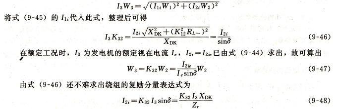 將式(9-43)和式(9-48)加以合并,就可得到復(fù)勵(lì)變壓器輸出電流的完整表達(dá)式。不過(guò)要注意,電壓分量I2o已經(jīng)在相位上滯后發(fā)電機(jī)電壓δ角(δ≈90°),也即I2o和I2i的相位關(guān)系應(yīng)該和圖9.31(a)所表示的相一致??紤]到這一特點(diǎn),發(fā)電機(jī)的勵(lì)磁電流可表示為